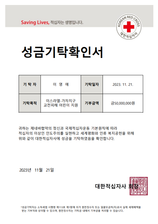 이영애는 21일 성금 5,000만 원을 대한적십자사에 전달했다. 그의 성금은 국제적십자운동 기관을 통해 가자지구 아동의 의료 지원, 구호품 전달 등에 쓰인다.