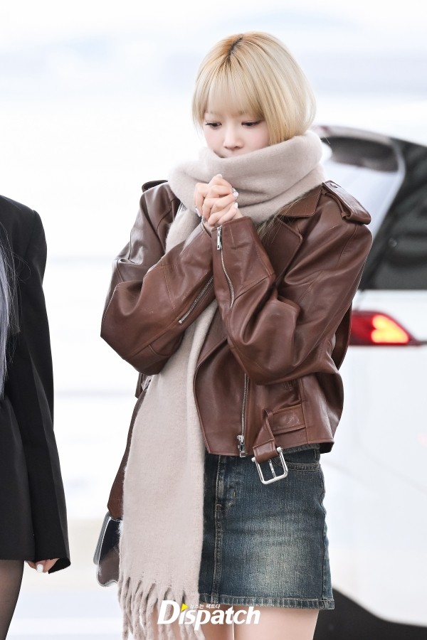 홍은채는 가죽 재킷과 데님 스커트로 멋을 냈다. 롱 머플러로 포인트를 줬다.