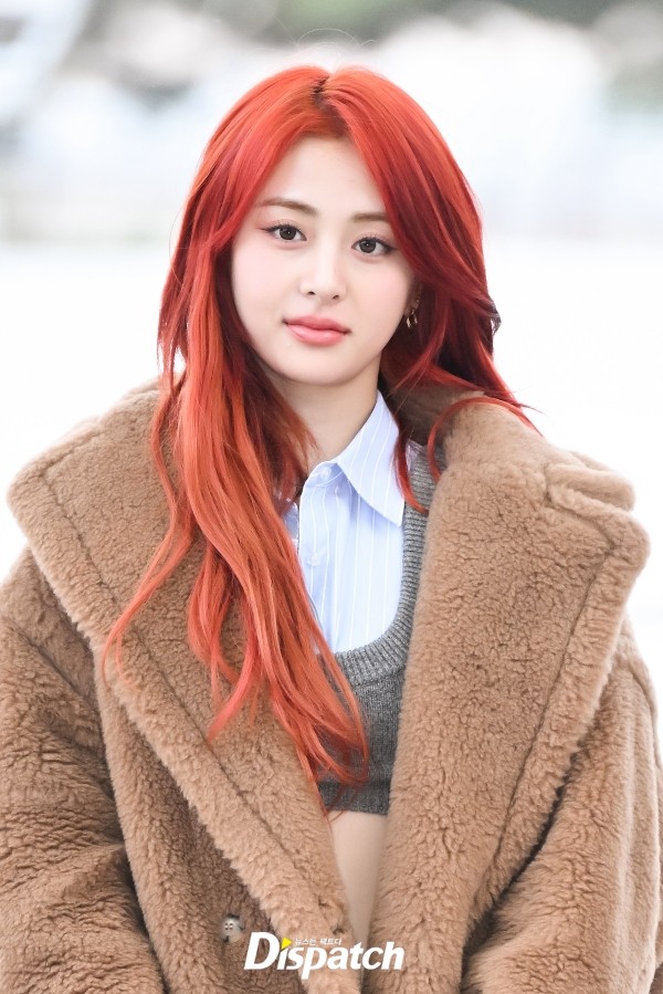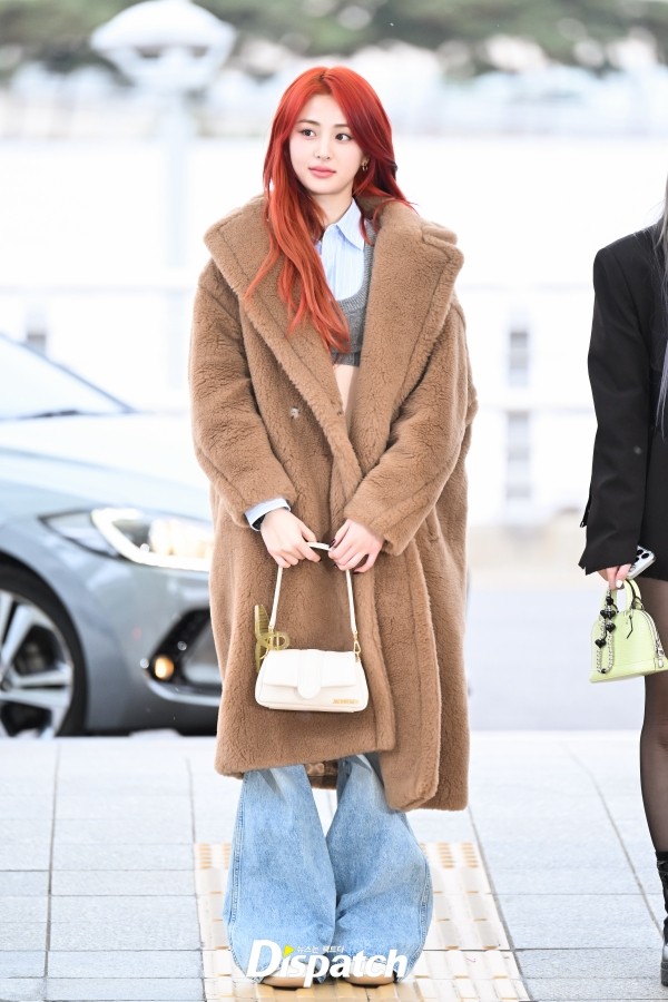 허윤진은 크롭티와 데님팬츠, 롱코트로 멋을 냈다. 아름다운 미모가 돋보였다.