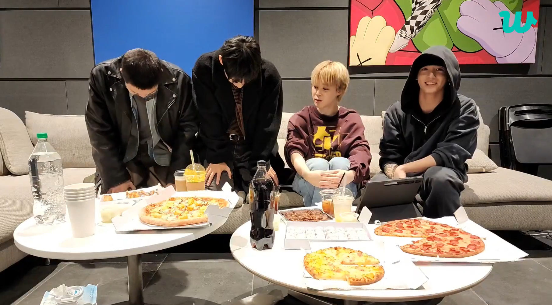 RM, 지민, 뷔, 정국은 5일 글로벌 팬 커뮤니티 플랫폼 위버스에서 단체 라이브 방송을 진행했다. 4명 이상 멤버가 함께 하는 건 진 입대 기념 방송 후 1년 만이다.