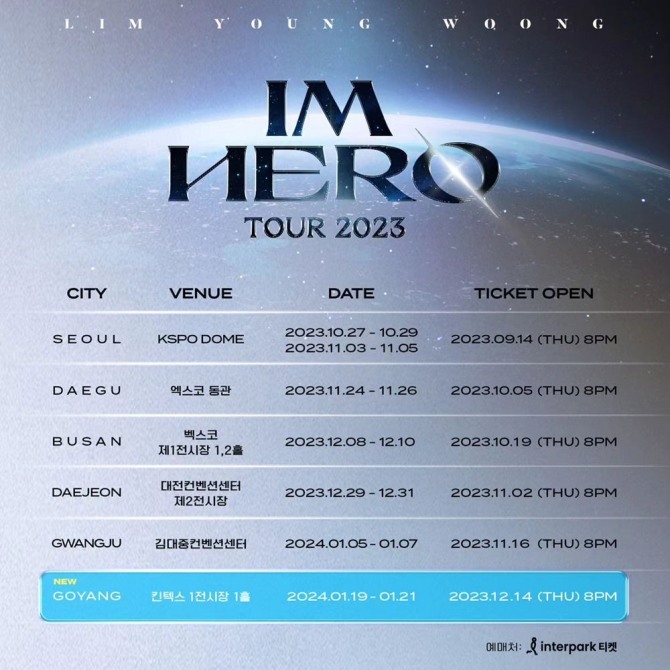 물고기뮤직 측은 7일 인스타그램에 '2023 전국투어 콘서트 '아임 히어로'(IM HERO) 스케줄 고양 추가 안내' 공지를 공개했다.