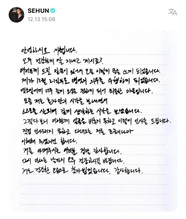 조용히 입소하고자 하는 본인의 의사를 존중해 구체적인 장소 및 시간은 공개하지 않는다. 세훈은 이날 자필로 소식을 전하기도 했다.