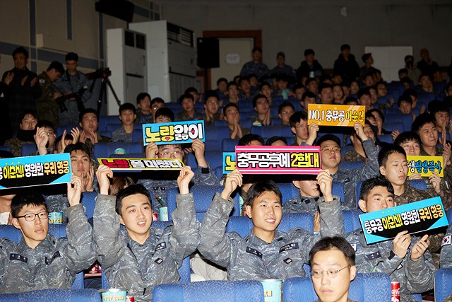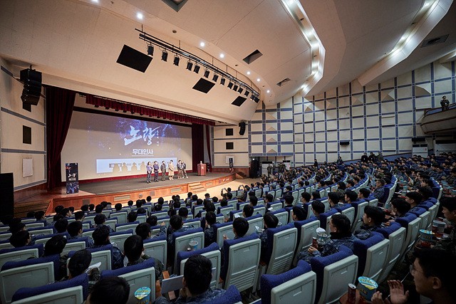 '노량' 측은 15일 오후 해군2함대사령부 충무관에서 영화 상영을 진행했다. 해군 장병들과 영화 출연진이 함께 하는 시간을 가졌다.