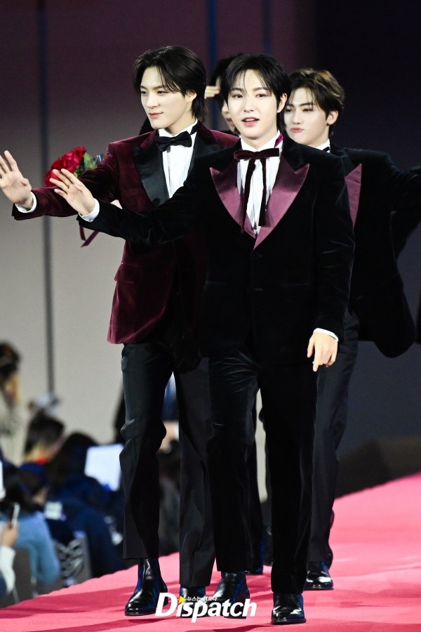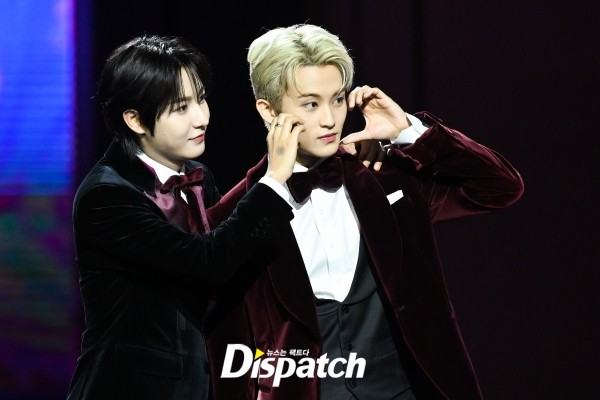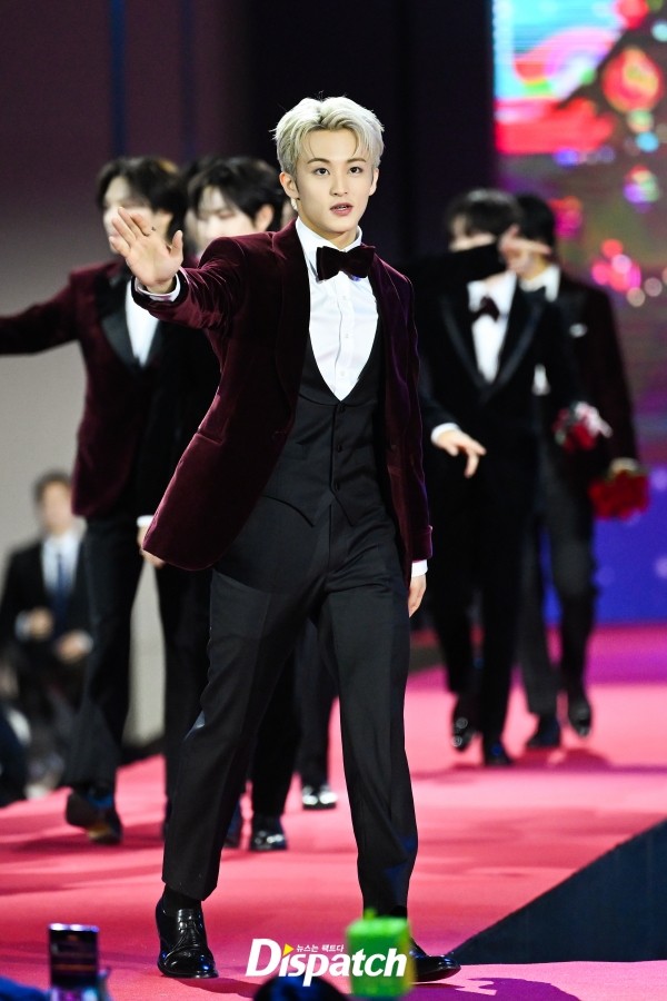 'NCT 드림'은 벨벳 턱시도로 멋을 냈다. 런쥔, 마크는 커플하트로 포즈를 취했다.