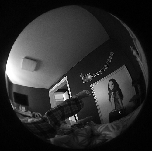 헝클어진 헤어, 화장기 없는 생얼이였지만 미모는 눈부셨다. 어안렌즈를 이용한 코믹버전도 함께 올렸다. 자신의 사진이 걸린 벽에 발을 갖다대며 재치있는 포즈를 취했다.