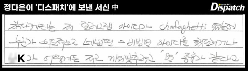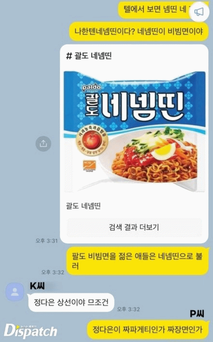 배경설명 : 정다은은 과거 'chafaghetti'라는 아이디로 활동했다. K씨는 '정다은이 짜파게티니까, 비빔면은 상선이다'라는 놀라운 추리력(?)을 과시했다.