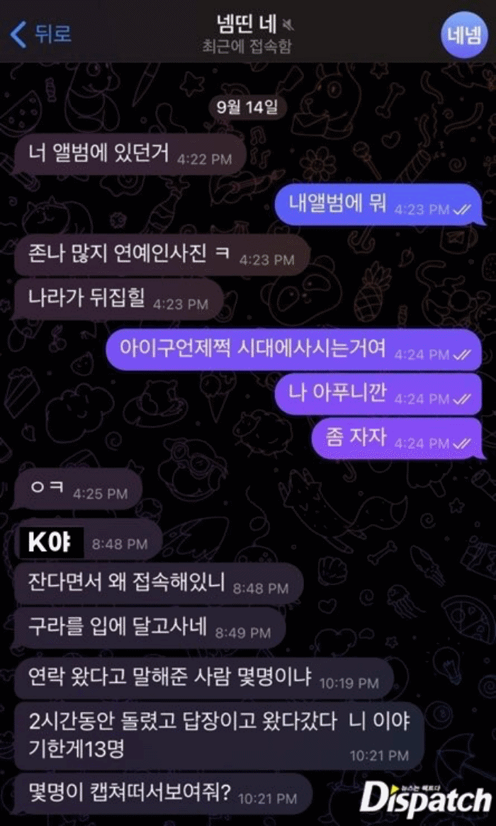 19. K씨는 연예인 손님에 대한 모든 것을 '톡' 중계했다.