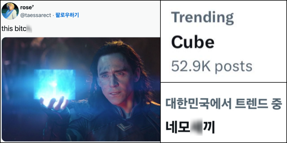 '러브 윈스 올' 뮤비가 공개되자마자 독특한 검색어가 등장했다. 'CUBE', '네모X끼' 등이다. 심지어 마블 캐릭터 로키가 큐브를 든 장면까지 끌올됐다.