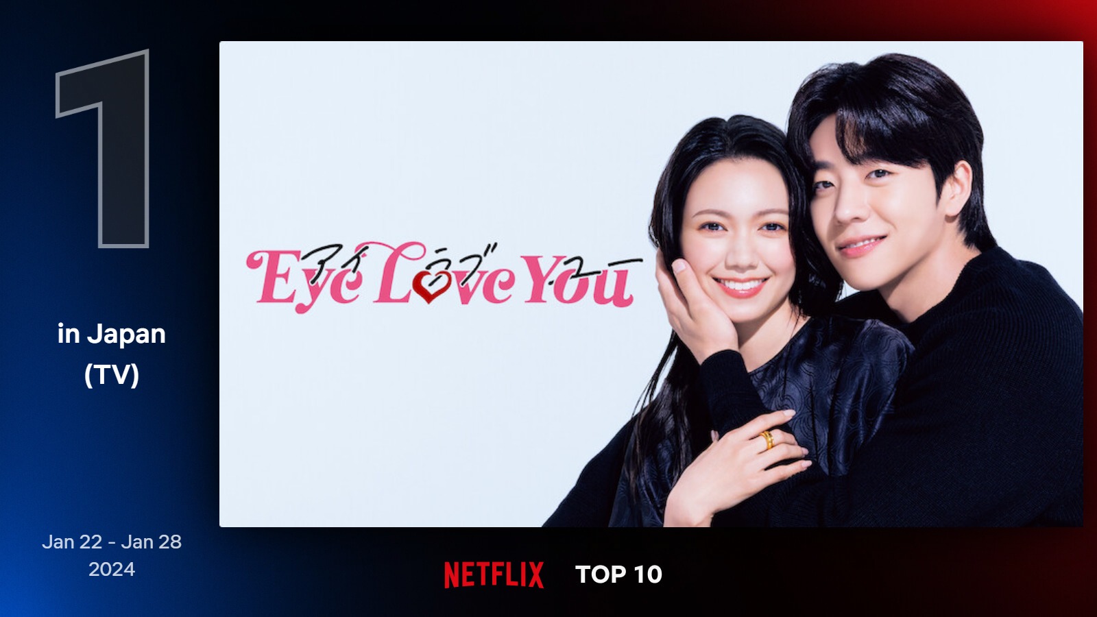 넷플릭스 톱 10 최신 집계(1월 22~28일)에 따르면, 일본 TBS '아이 러브 유'(Eye Love You)는 톱 10 재팬 TV 부문 1위를 차지했다.