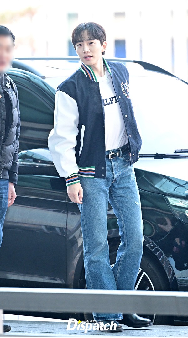 이준호는 야구 재킷과 데님진으로 캐주얼한 공항패션을 연출했다. 조각같은 비주얼과 스윗한 미소도 돋보였다.
