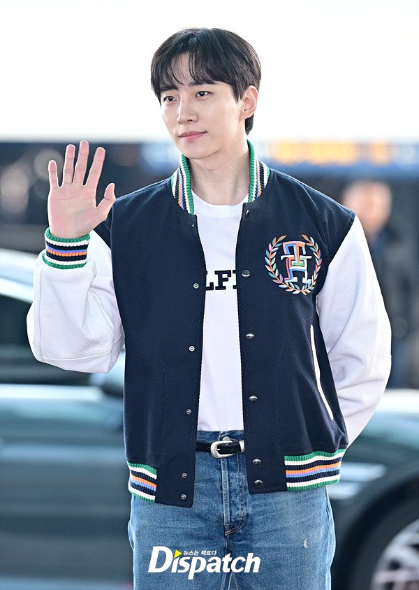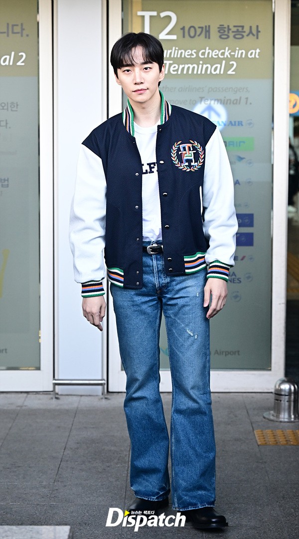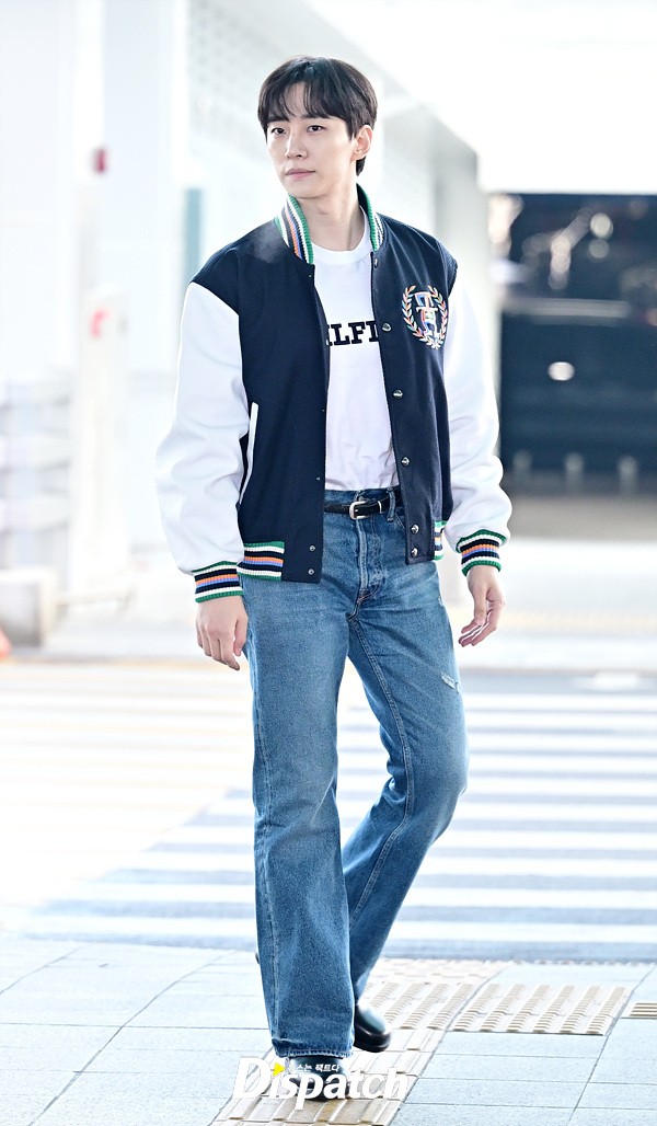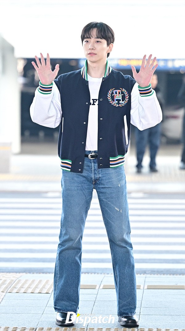 이준호는 야구 재킷과 데님진으로 캐주얼한 공항패션을 연출했다. 조각같은 비주얼과 스윗한 미소도 돋보였다.