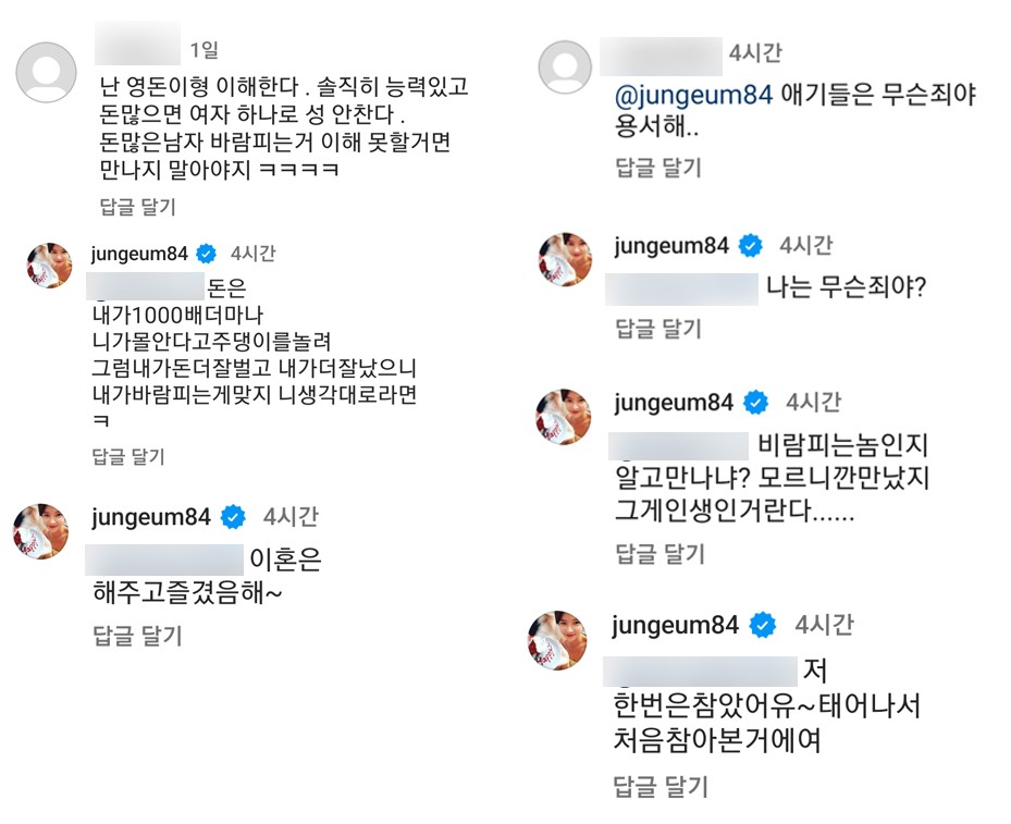 다른 네티즌이 "애기들은 무슨 죄냐. (이영돈을) 용서해"라고 달자, "나는 무슨 죄야?"라고 즉각 답변하기도 했다. "(이영돈이) 이혼은 해 주고 즐겼으면 해"라는 댓글도 달았다.