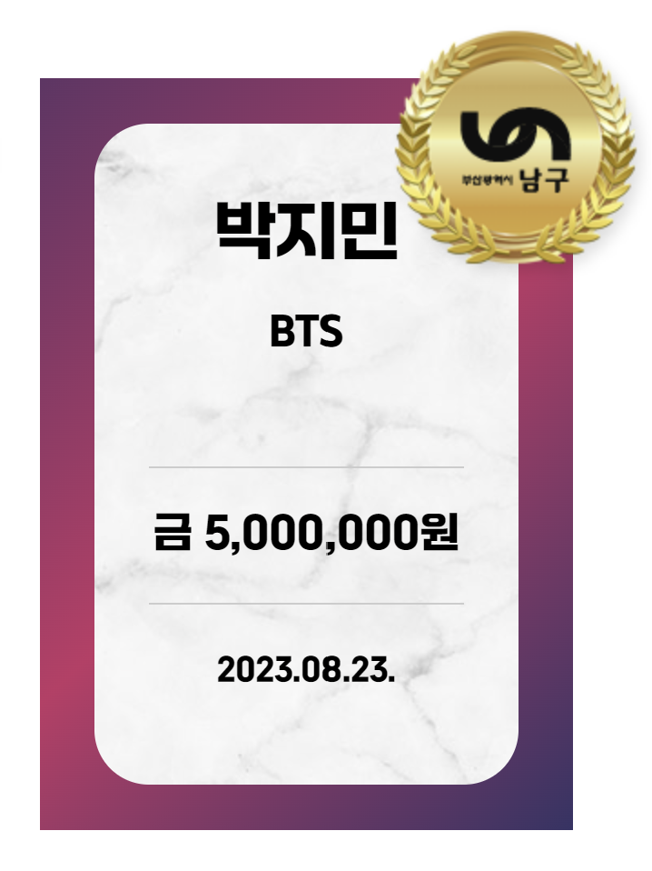 부산 남구 관계자는 당시 디스패치와 전화통화에서 "지민이 우리 구에 500만 원을 기부한 게 맞다"며 "아버님이 추천해주신 걸로 안다. 감사드린다"고 밝혔다.