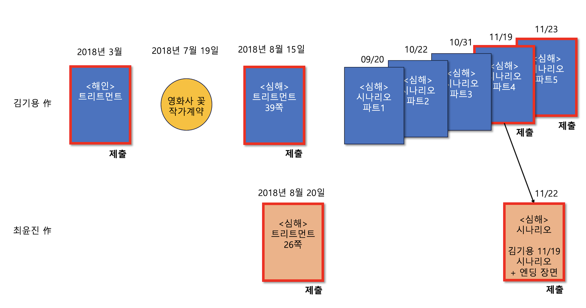 김기용 작가는 8월 15일, '심해' 트리트먼트를 완성했다. 당시, 김기용과 최윤진은 협업 관계였다. 김 작가는 최윤진과 상의하며 일부 내용을 수정했다.