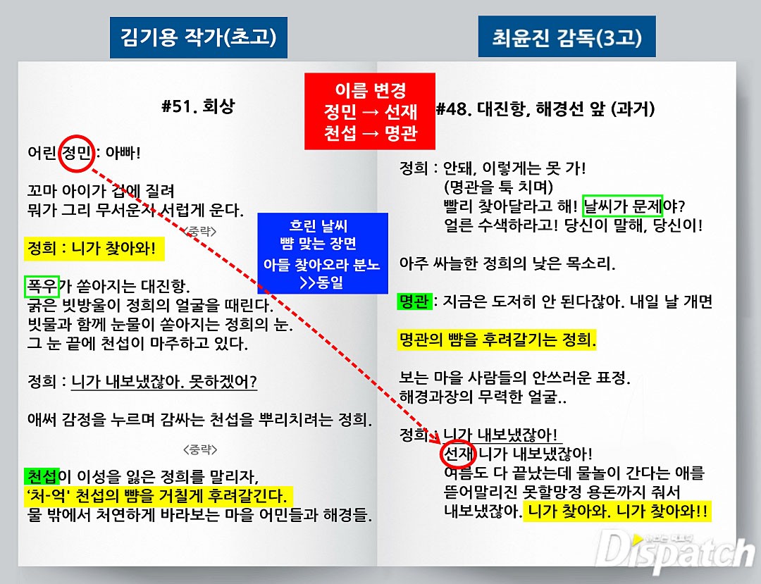 "그때 최윤진 버전이 있다는 사실을 처음 알았습니다. 제 초고와 크게 다르지 않았습니다. 거의 윤색 수준이었죠. 내 시나리오가 탈취됐구나… 당황스러웠습니다." (김기용)