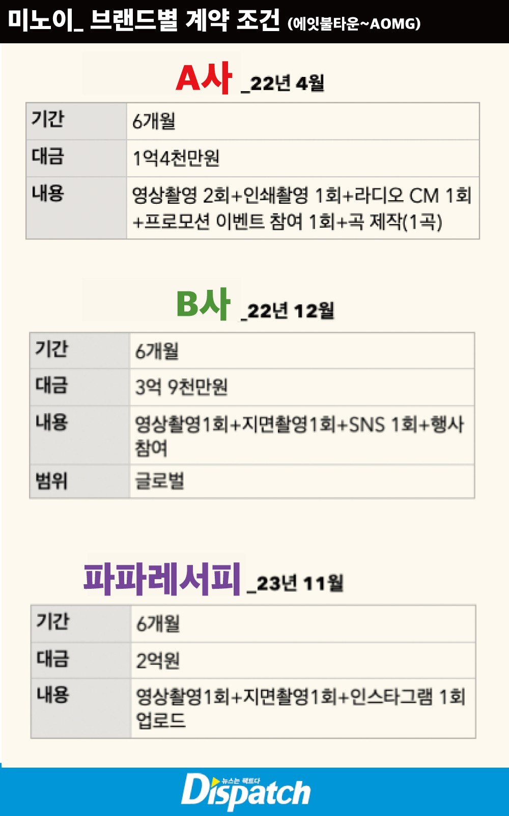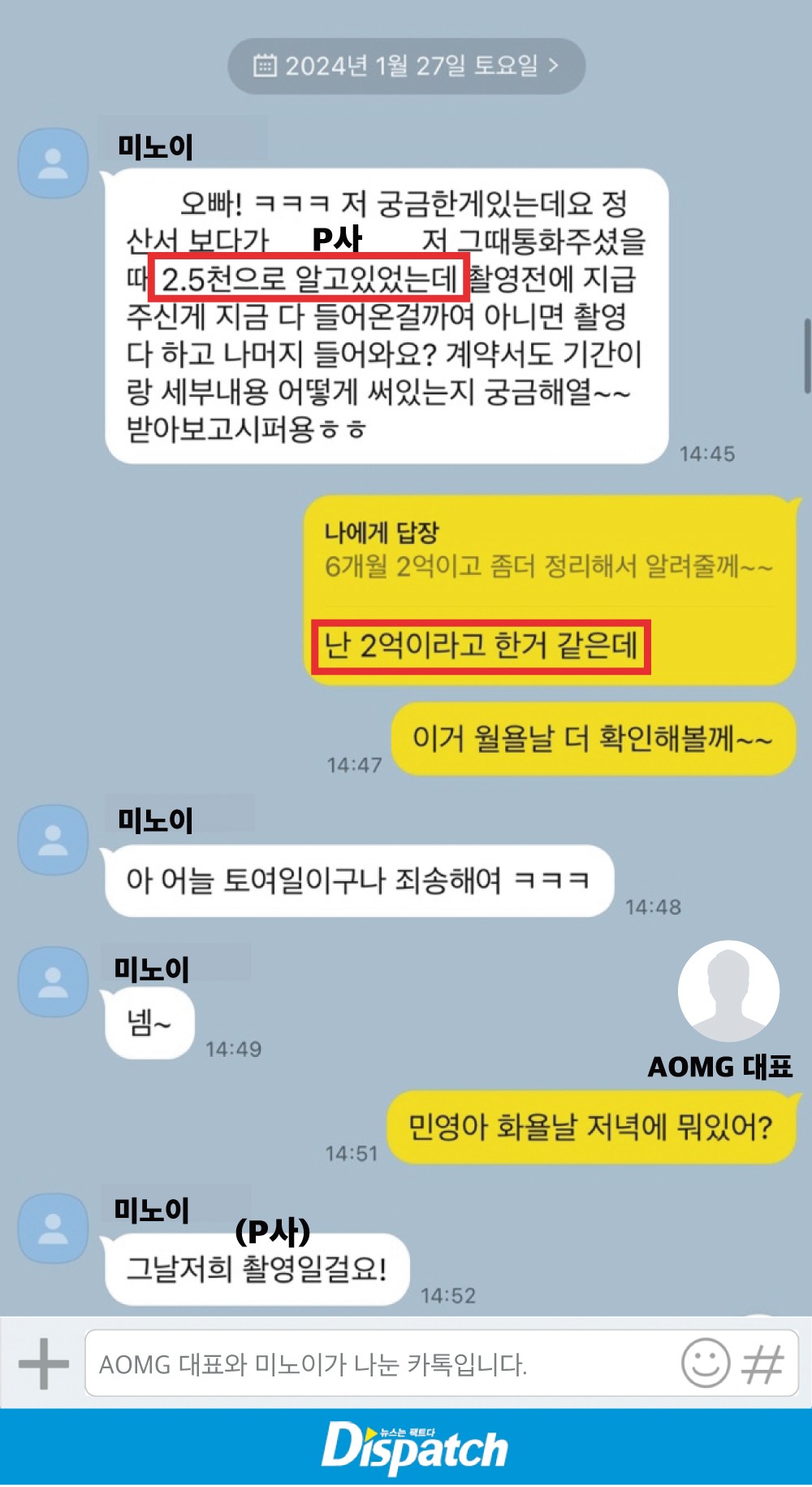 '디스패치' 취재 결과, 미노이는 (최종적으로) 6개월에 4억 원, 또는 3개월에 2억 원을 요구했습니다. 이는 미노이와 AOMG가 나눈 대화록에서 확인됩니다.