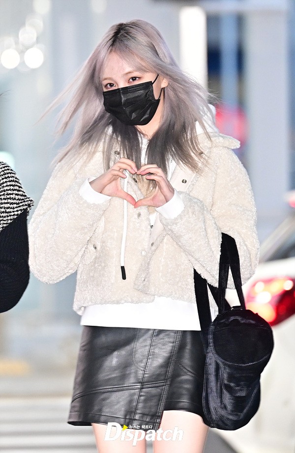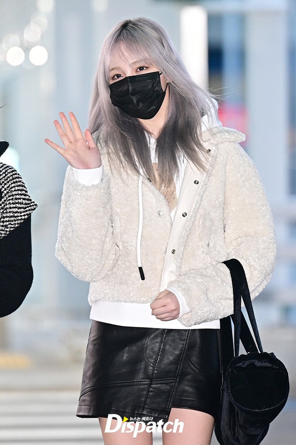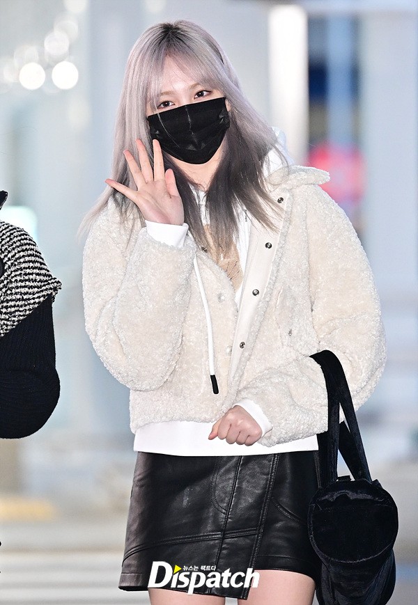 리즈는 마스크에도 또렷한 비주얼로 눈길을 끌었다. 퍼 점퍼와 미니 스커트로 연출한 깜찍한 공항패션도 시선을 모았다.