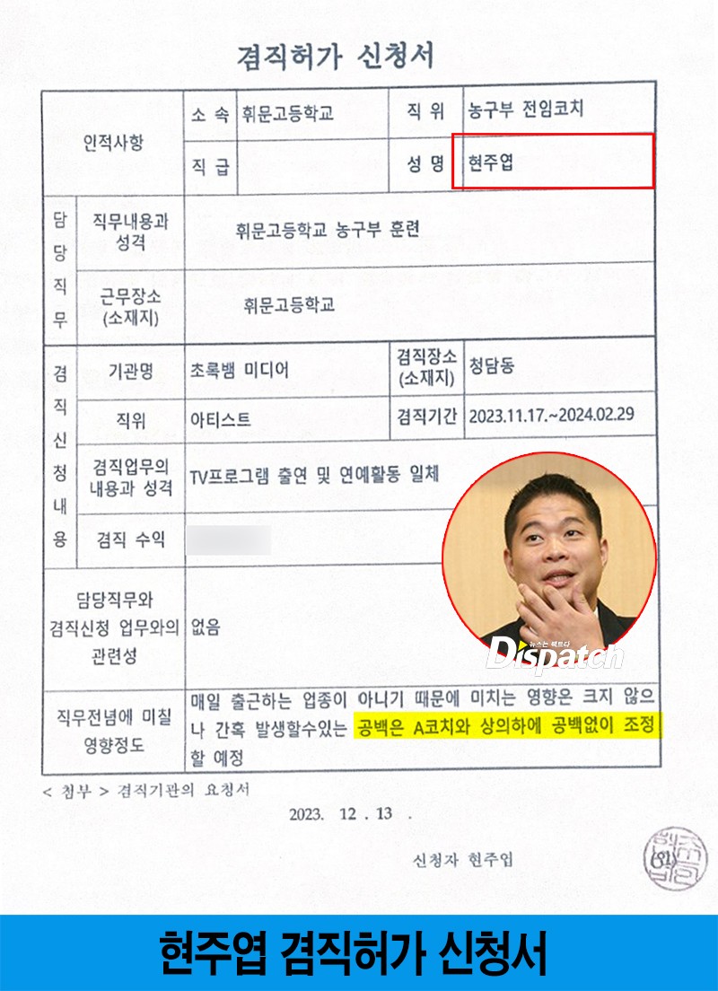 '디스패치'가 교육청에 문의한 결과, 현주엽은 해당되지 않았다. 현주엽의 경우 교직원이 아니라 운동부 계약직이라는 것. 또한 휘문고는 국공립이 아니라, 자율형 사립고다.