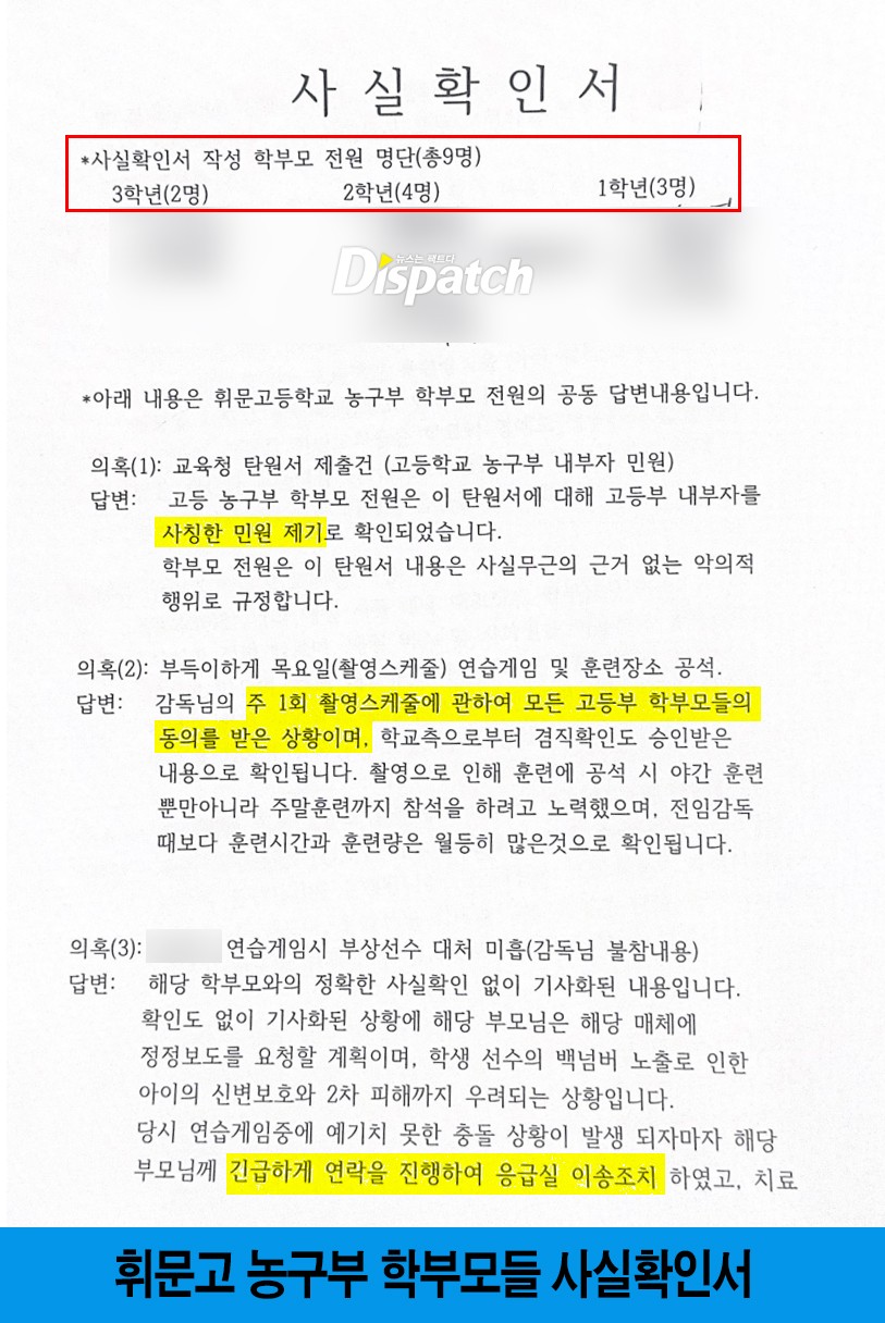 휘문고 농구부 학부모들은 해당 보도를 한 줄 한 줄 반박했다. 이어, 교육청에 제출한 사실확인서를 꺼냈다. "학부모 전원이 '탄원서 내용은 사실이 아니'라는 확인서를 냈다"며 부연설명했다.