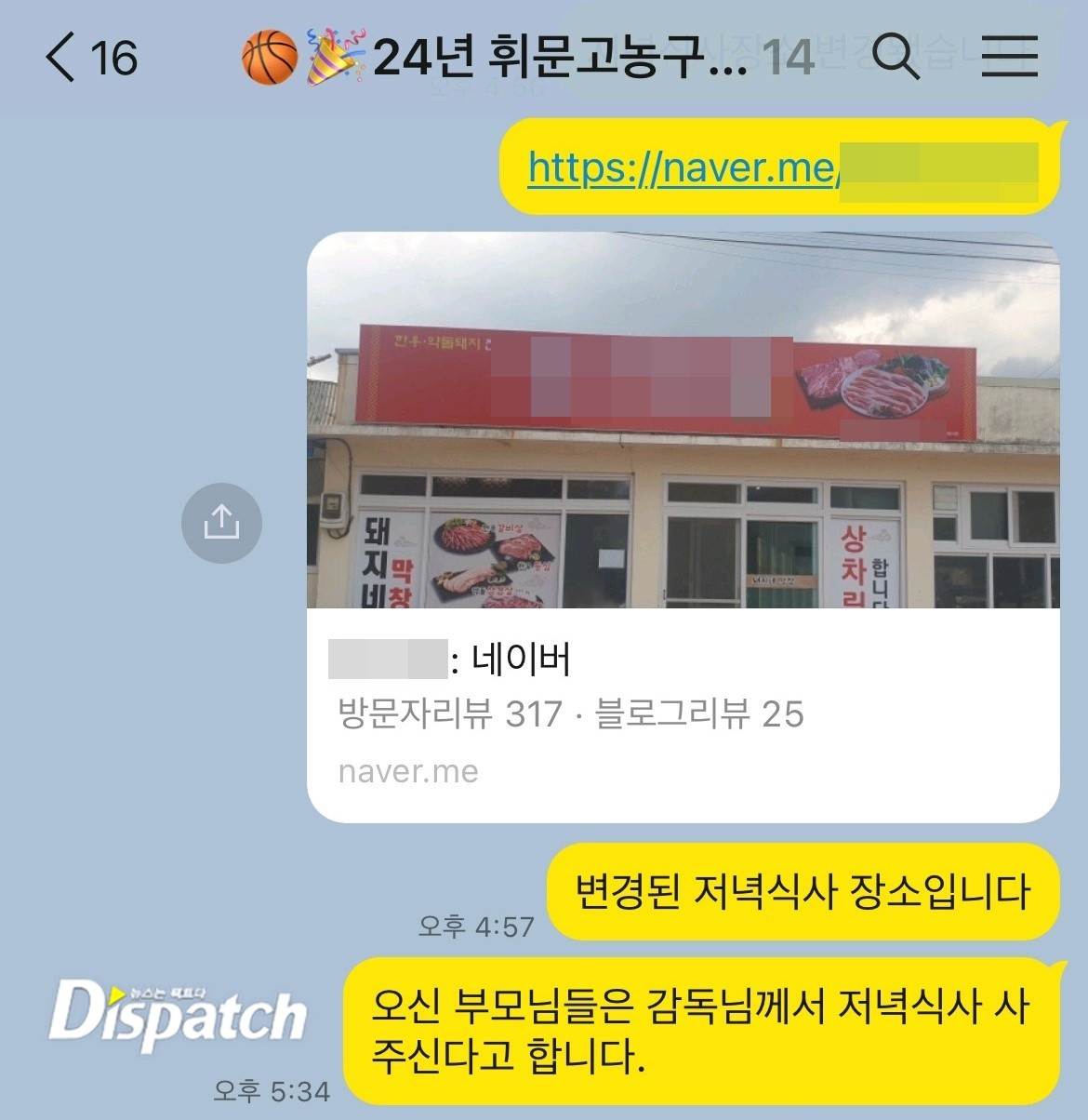 한 학부모가 휘문고 농구부 단체 카톡방을 보여줬다. 현주엽 감독이 회식비를 쏜다는 내용이 있었다.