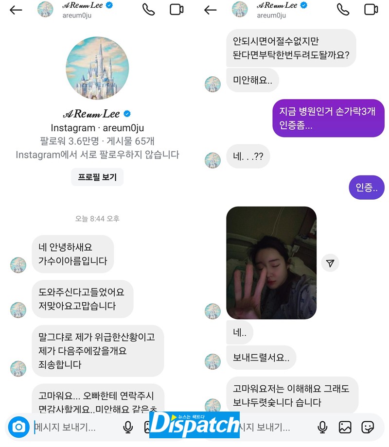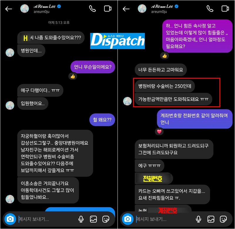 아름이 의식을 회복했다. 둘은, 즉시 '인친'들에게 DM을 보냈다. "아름이 고려대 안산병원에 입원했다"며 병원비를 부탁한 것. 그러나 성과를 거두지 못한 것으로 확인된다.