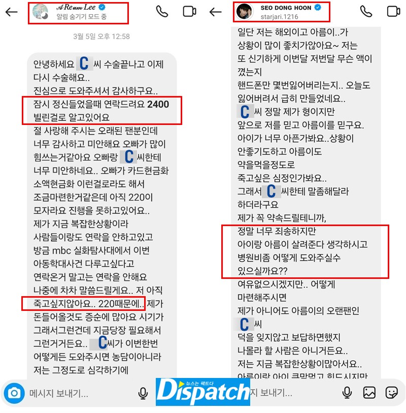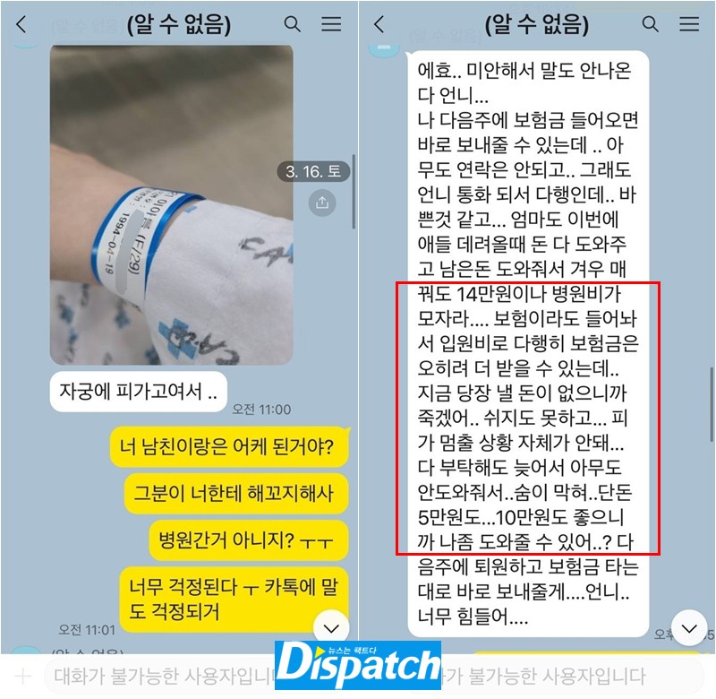 서동훈도 병원 인증샷을 여러 곳에 뿌렸다. 대상은, 아름의 '인친'. E씨와 F씨에게 연락, 중대병원 입원 사진을 들이밀었다. "아름이가 지금 많이 아프다"며 돈을 요구한 것.