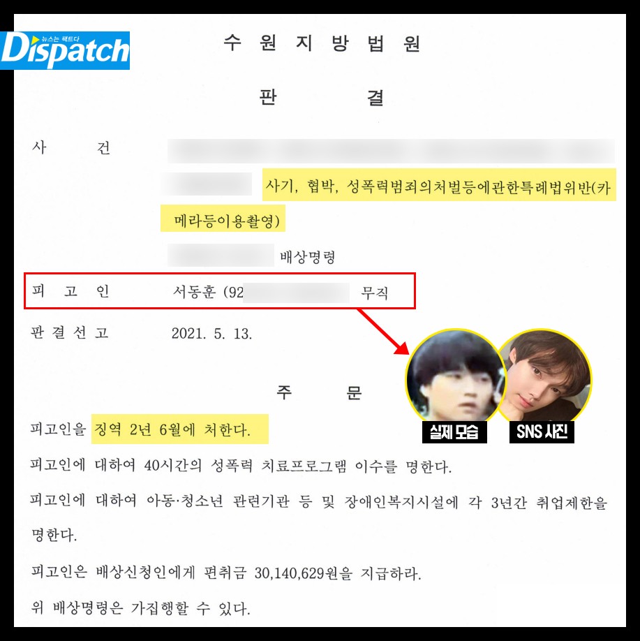 그리고 2021년 5월 13일, 서동훈은 징역 2년 6개월의 실형을 선고받았다. 사기죄, 협박죄, 성폭력 범죄 등이 인정된 것. 사건 피해자는 전 여자친구 2명을 포함해 총 3명이다.