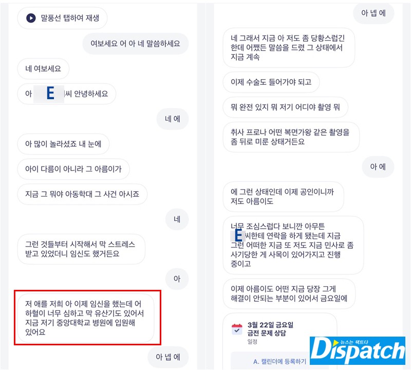 서동훈 : 아동학대 사건 아시죠? 아름이가 그런 것부터 시작해서 스트레스받고 있었고. 임신도 했거든요. 그런데 하혈이 너무 심하고 유산기도 있어서 지금 중앙대학교 병원에 입원해 있어요.