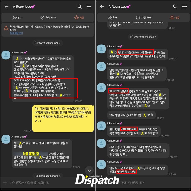A씨는 응답하지 않았다. 그러자 아름은 2024년 2월, "(내가) 너무 아프다", "(지금) 차 사고가 났다", "병원에 가야 된다", "3일 후에 돈 들어온다"며 다시 부탁했다.