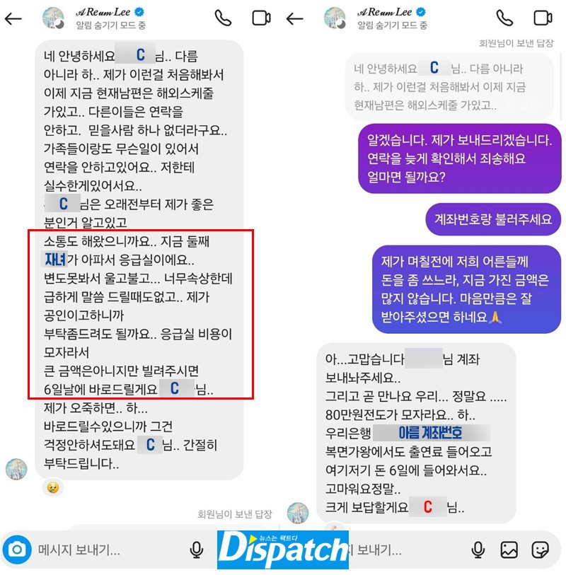 B씨는 '디스패치'에 "200만 원 중에 100만 원은 돌려받았다"면서 "그러나 돈보다 화가 나는 건, 정말 (그녀를) 걱정한 사람까지 이용한 것"이라고 분노했다.