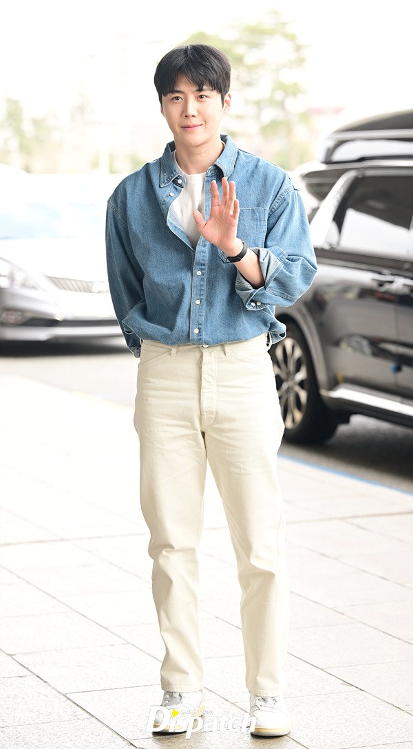 김선호는 데님 셔츠와 화이트 팬츠로 댄디한 공항패션을 선보였다. 공항에 모인 팬들을 위해 하트 포즈로 화답했다.