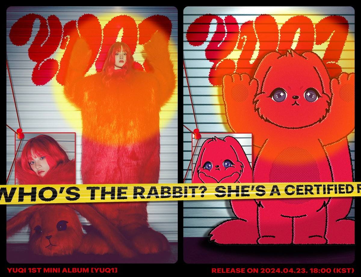 우기는 토끼 탈을 쓴 채 러블리한 비주얼을 자랑했다. 폴리스 라인 테이프 위에는 '후즈 더 레빗?'이라는 문구가 적혀 있었다.