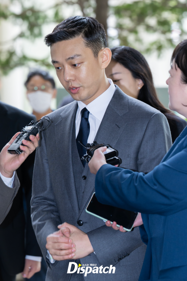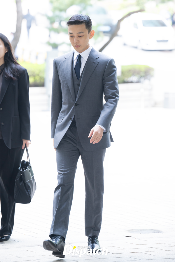 유아인은 회색 정장을 입고 등장했다. 재판 출석 길에 취재진에 대마 흡연 교사 혐의를 부인했다. "오늘 법정에서 밝히겠다"고 알렸다. 법정엔 같은 혐의를 받는 유아인 지인 최모 씨도 자리했다.