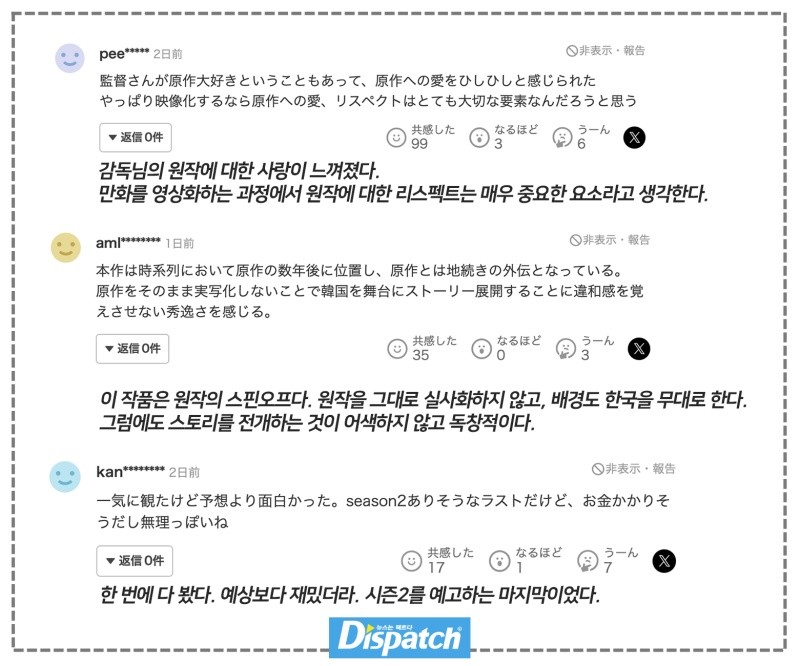 "재미있어서 단숨에 다 봤다", "원작에 대한 리스펙이 느껴진다", "일본판과는 달리 인간미와 감정을 표현해서 좋았다"