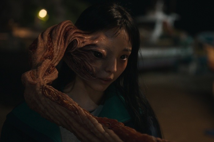 원작에선 기생생물이 손에서 튀어나왔다면, 이번엔 머리를 열고 모습을 드러낸다. 유연한 촉수의 형태. 더 기괴한 비주얼로 연상호만의 크리처를 탄생시켰다.