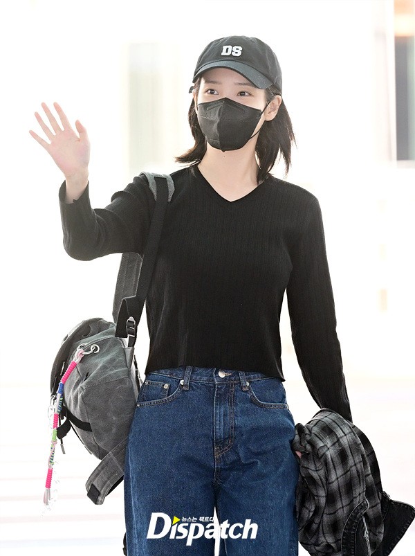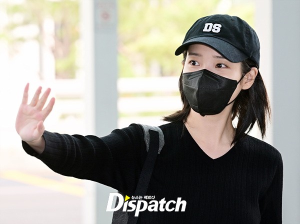 아이유는 모자와 마스크에도 러블리한 비주얼로 시선을 모았다. 공항에 모인 팬들을 위해 손인사로 화답했다.