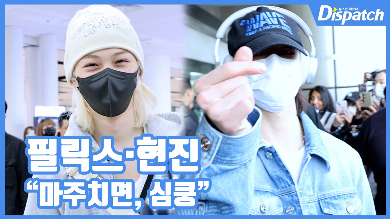 '스트레이 키즈(Stray Kids)' 필릭스, 현진이 취재진의 카메라에 눈이 마주치는 순간 눈웃음과 손하트 포즈를 취했다.