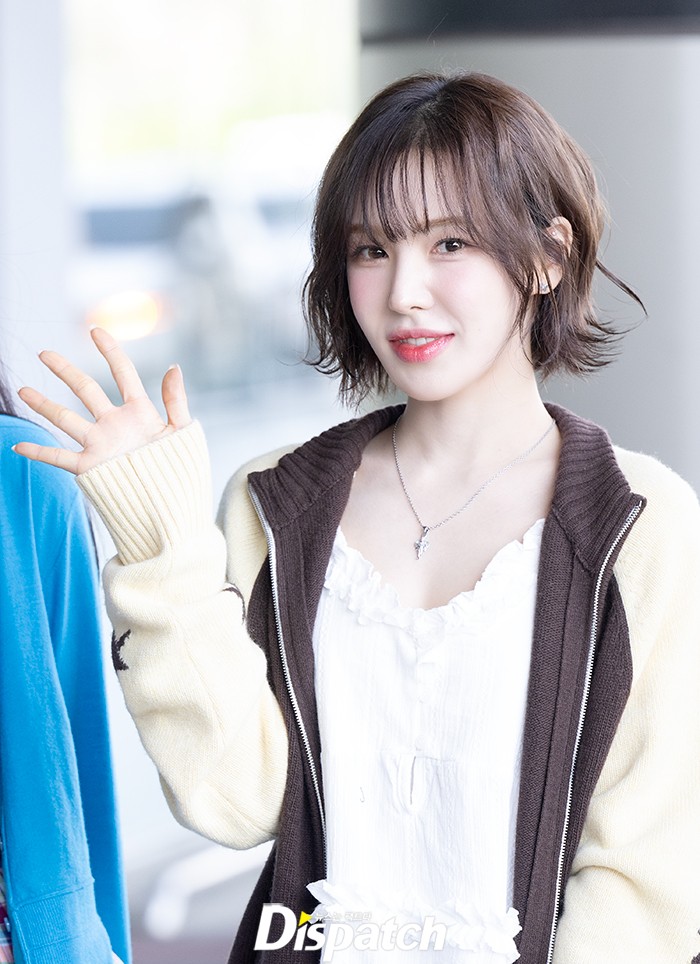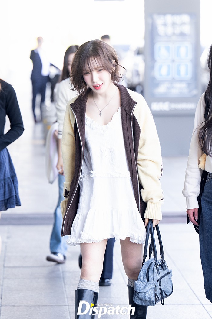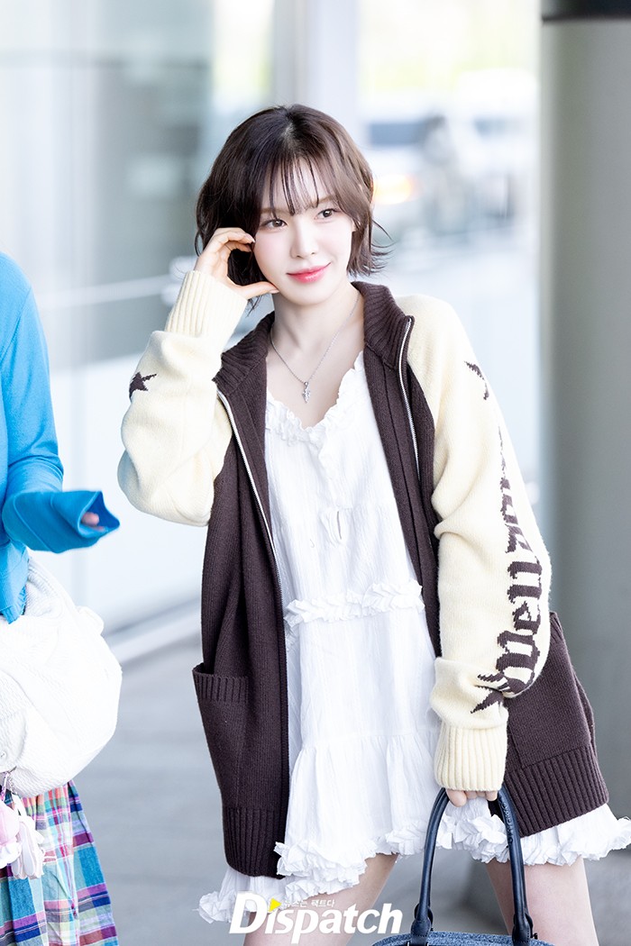 웬디는 흰 블라우스에 니트로 청순한 공항패션을 연출했다. 우아한 미모가 돋보였다.