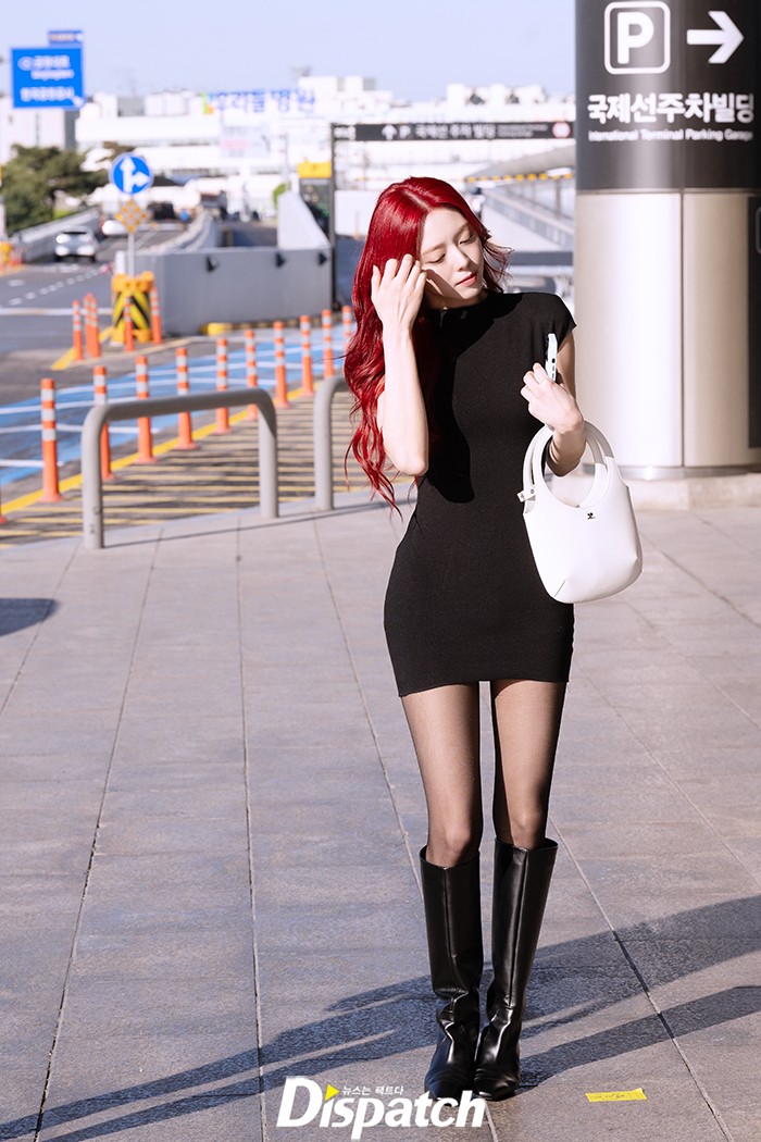 유나는 블랙 원피스로 시크한 공항패션을 연출했다. 우아한 분위기가 돋보였다.