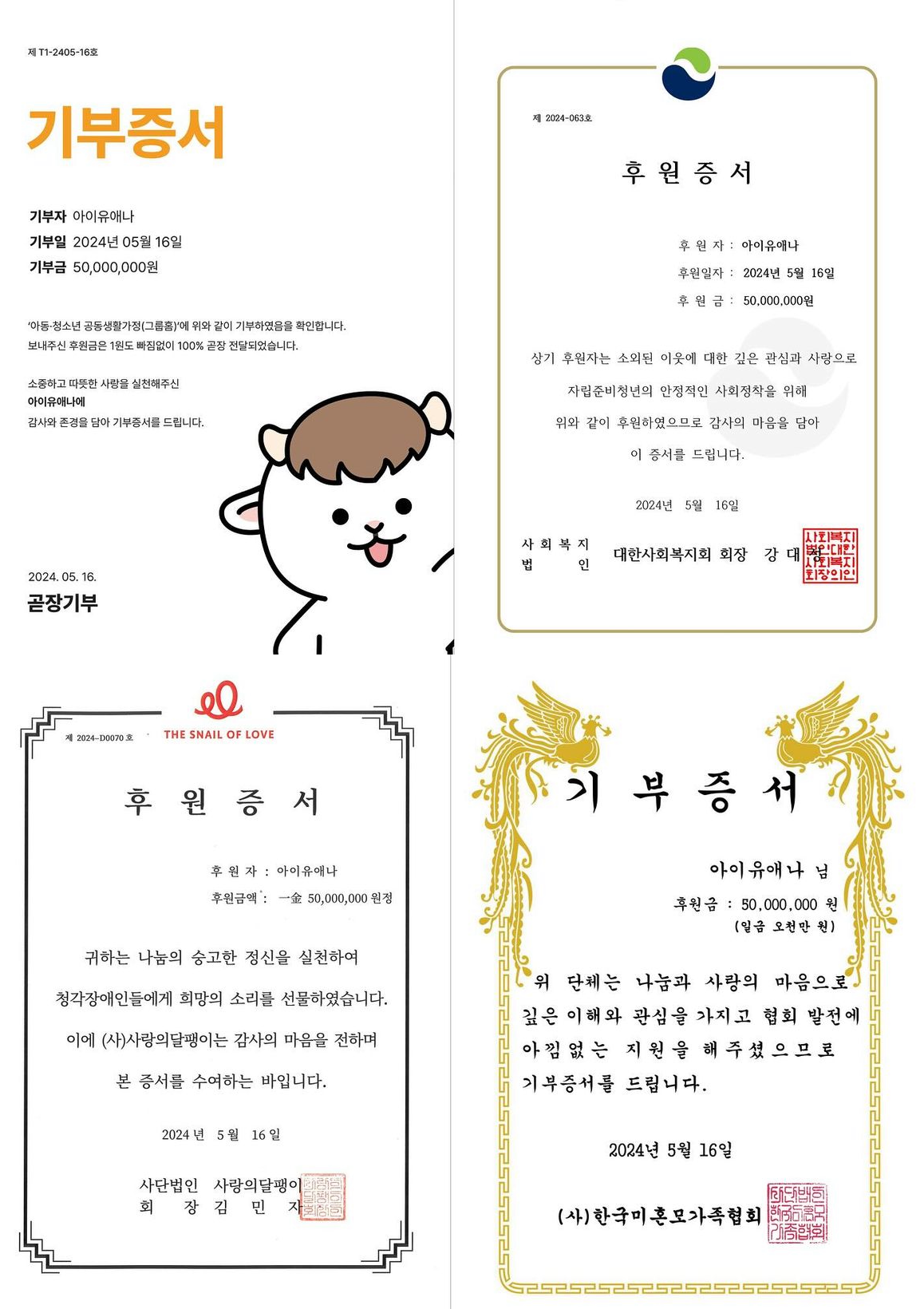 아이유는 이날 아동·청소년 공동생활가정(그룹홈), 대한사회복지회, 사랑의달팽이, 한국미혼모가족협회에 각각 5,000만 원을 쾌척했다.