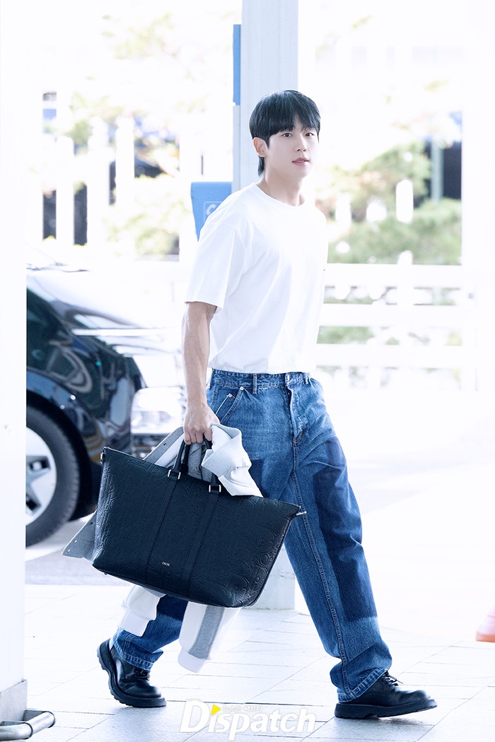 정해인은 이날 청바지에 화이트 티셔츠로 댄디한 공항패션을 연출했다. 훈훈한 비주얼이 돋보였다.