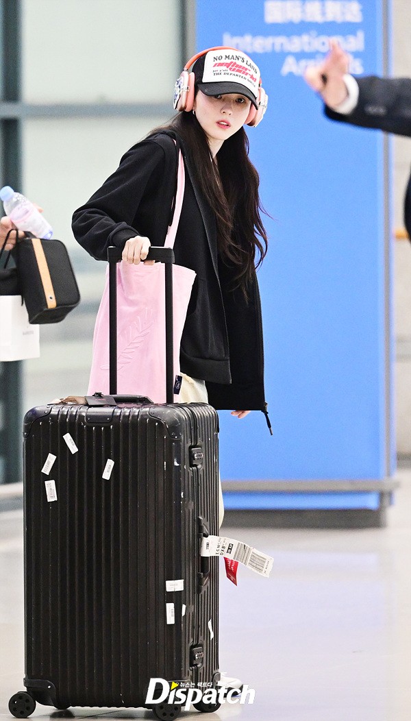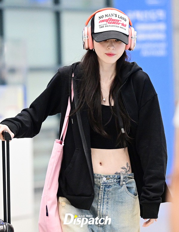 한소희는 파격적인 스타일로 눈길을 끌었다. 크롭톱 상의와 와이드진, 헤드폰으로 힙한 공항패션을 완성했다.