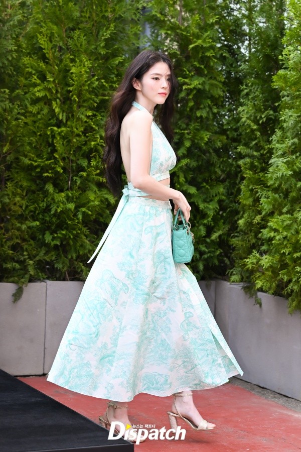 한소희는 민트 컬러의 오프숄더 원피스로 아름다움을 뽐냈다.