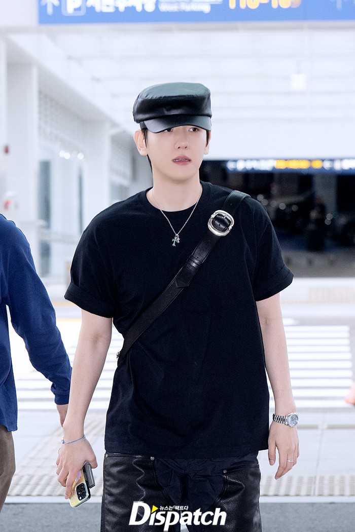 백현은 블랙 팬츠에 티셔츠를 매치해 댄디한 공항패션을 연출했다. 훈훈한 비주얼이 돋보였다.