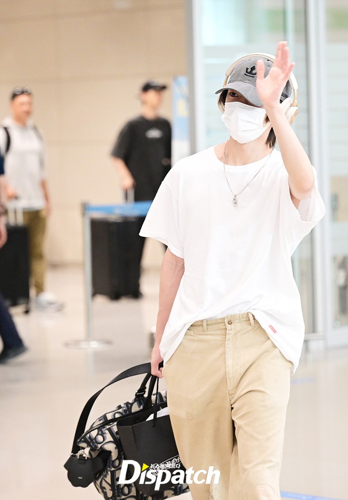 범규는 화이트 티셔츠와 모자로 심플한 공항패션을 완성했다. 마스크에도 훈훈한 비주얼이 돋보였다.