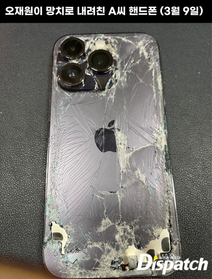A 씨의 아이폰은 박살났다. "휴대폰을 들고 계단을 올라가는데 오재원이 쫓아와서 제 멱살을 붙잡았다. 저를 끌고 내려갔다. 도망가기 위해 한 칸 올라가니, 야구 방망이를 바닥으로 치며 한 발짝만 더 올라가봐 죽인다고 했다"고 말했다.