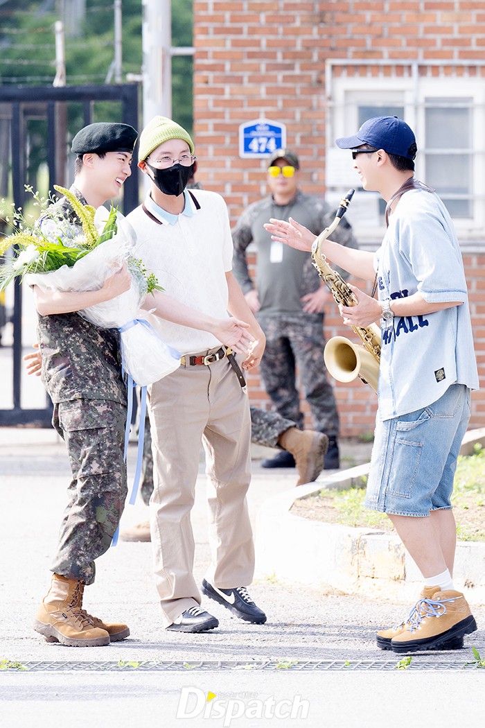 슈가를 제외한 RM, 제이홉, 정국, 뷔, 지민이 함께 부대를 찾아 진의 전역을 축하했다.