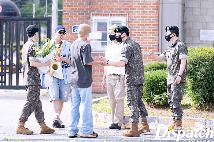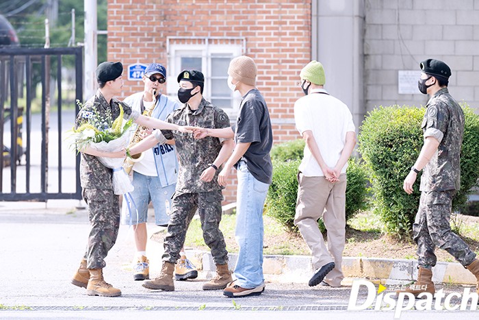 슈가를 제외한 RM, 제이홉, 정국, 뷔, 지민이 함께 부대를 찾아 진의 전역을 축하했다.