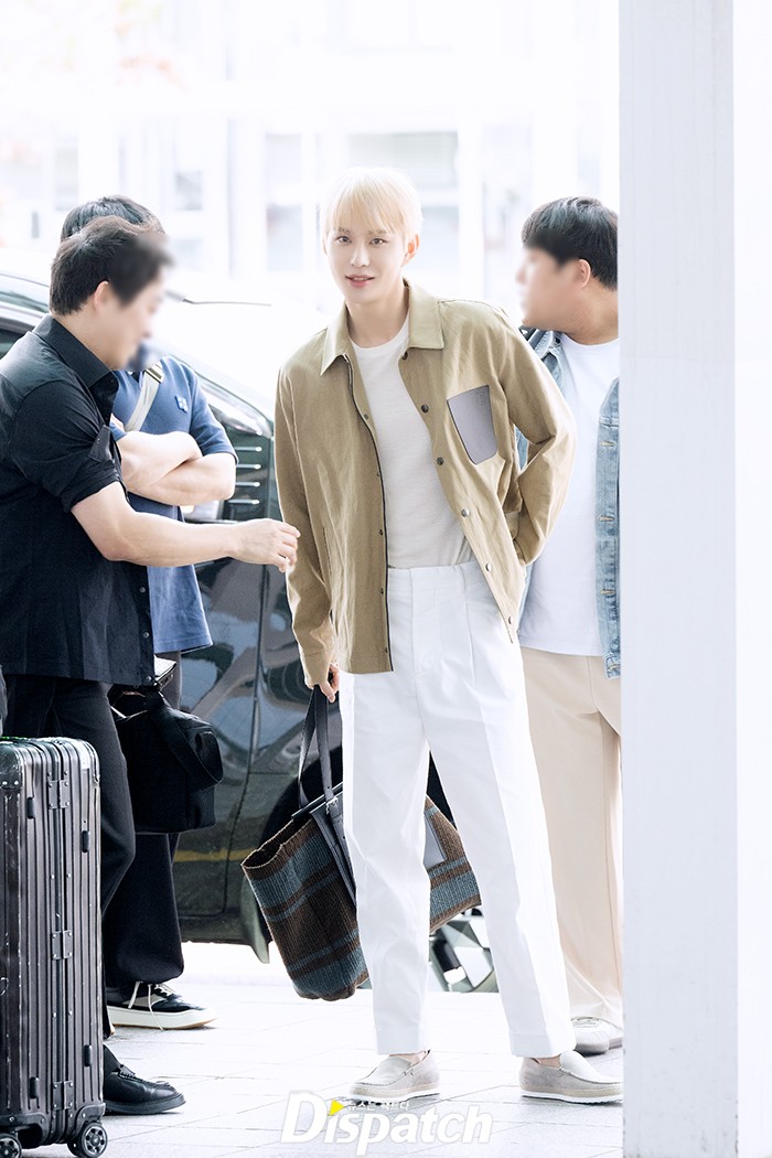 정우는 이날 화이트 팬츠에 베이지 재킷으로 댄디한 공항패션을 연출했다. 훈훈한 비주얼이 돋보였다.