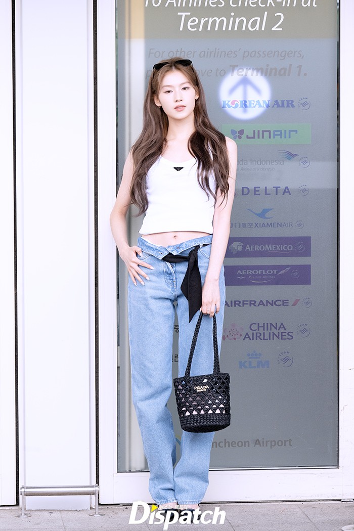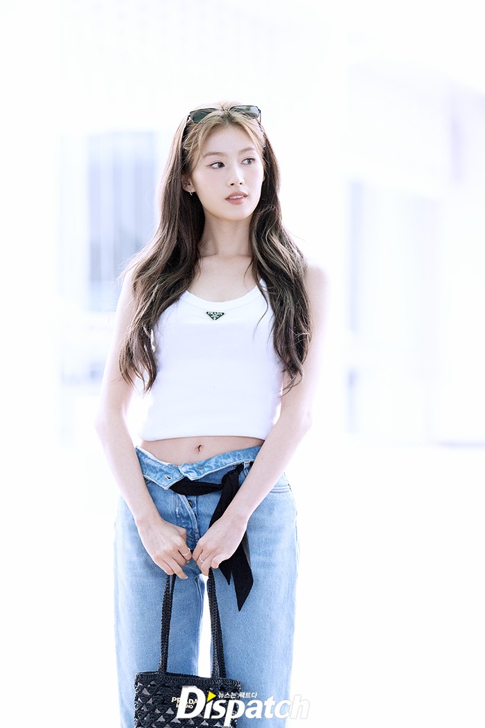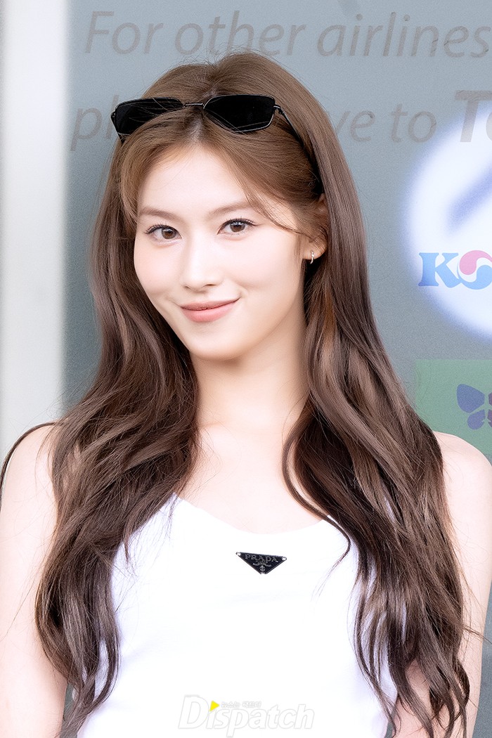 사나는 이날 청바지에 티셔츠로 러블리한 공항패션을 연출했다. 우아한 미모와 청순한 비주얼이 돋보였다.